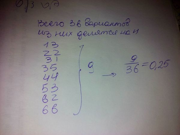 Значит, вероятность того, что при броске двух кубиков сумма будет делиться на 4 Р=1/2·1/2=1/4=0,25