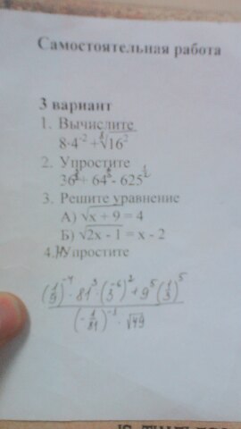 1) (8/16)+16^(1/4)=(1/2)+2=2,5 2) плохо видно 3) а) х=9=16 х=7 б) Возводим в квадрат при условии 2х-1 больше или равно 0 и х-2 больше или равно 0 2х-1=х^2-4x+2 x^2-6x+3=0 D=3 ± sqrt(3) 3-sqrt(3) не удовл. усл. х больше или равно 2 О т в е т. 3+sqrt(3)