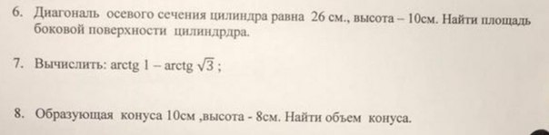 6. Диагональ осевого сечения цилиндра равна 26 см., высота – 10см. Найти площадь боковой поверхности цилиндра. 7. Вычислить: arctg 1 – arctg √3 ; 8. Образующая конуса 10см, высота - 8см. Найти объем конуса.
