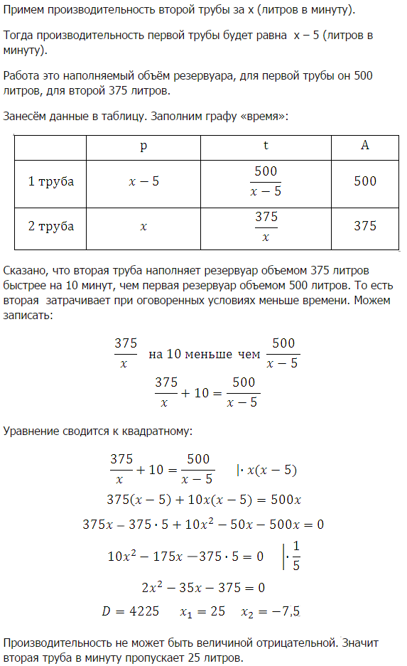 Первая труба пропускает на 5 литров воды в минуту меньше, чем вторая. Сколько литров воды в минуту пропускает вторая труба, если резервуар объемом 375 литров она заполняет на 10 минут быстрее, чем первая труба заполняет резервуар объемом 500 литров?