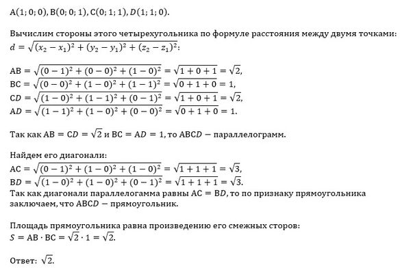 Дано точки А(1;0;0), В(0;0;1), С(0;1;1), D(1;1;0). Знайдіть площу чотирикутника ABCD