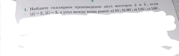 Найдите скалярное произведение двух векторов а → и → b, если а = 2, b = 3, а угол между ними равен:а)45 градусов; б)90 градусов; в)135 градусов; г)180 градусов.