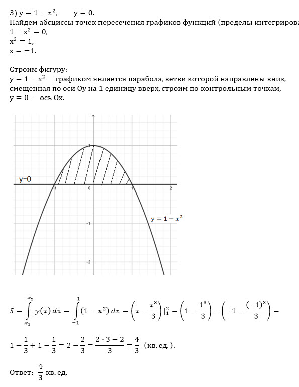 ПОМОГИТЕ ПОЖАЛУЙСТА С ПОДРОБНЫМ РЕШЕНИЕМ Вычислите площадь фигуры, ограниченной линиями 1)y=x^2,x=1,x=2,y=0; 2)y=sinx,y=0,x=0,x=π/2 3)y=1-x^2,y=0