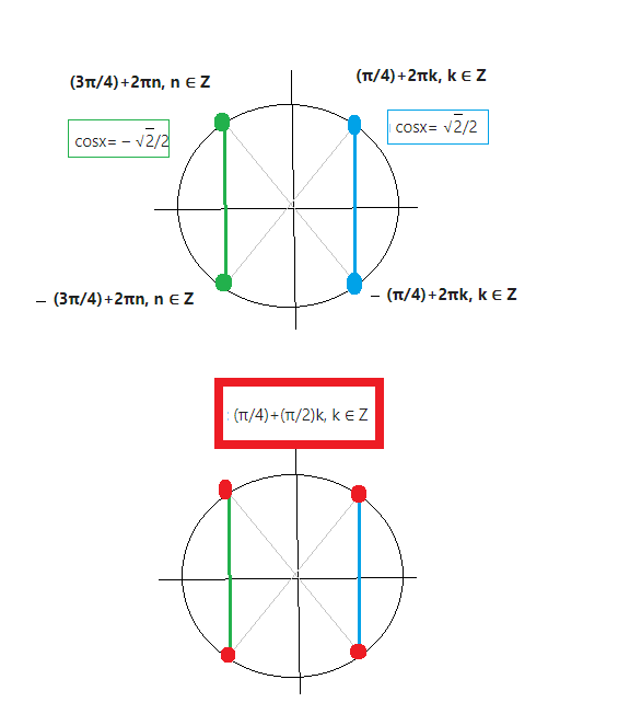 x= ± (3π/4)+2πn, n ∈ Z или x= ± (π/4)+2πk, k ∈ Z