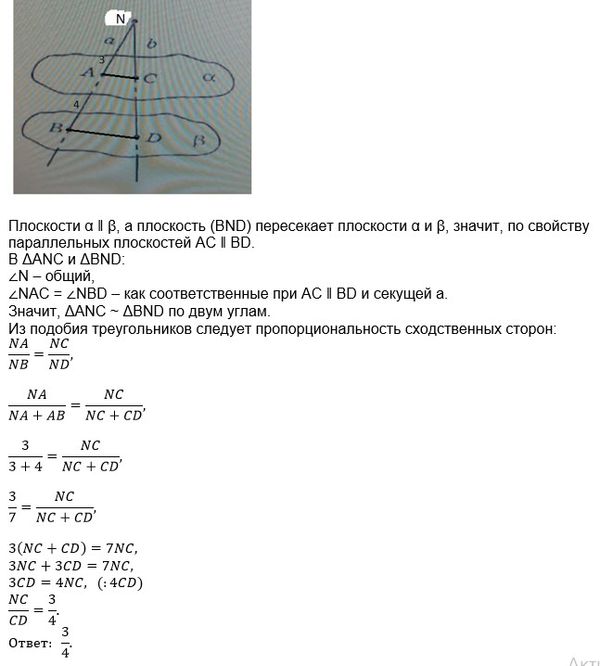 Прямые a и b пересекаются в точке N. Плоскость α и β параллельны. Прямая а пересекает плоскость а в точке А1, а плоскость β в точке В. Прямая b пересекает α в точке С, а плоскость β в точке D. AN/AB=3/4, Найдите NC/CD.