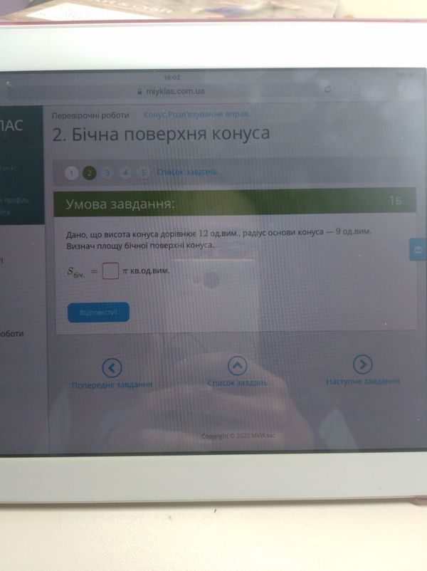 Дано, що висота конуса дорівнює 12 од.вим, радіус основи конуса 9 од.вим. Визнач площу бічної поверхні конуса