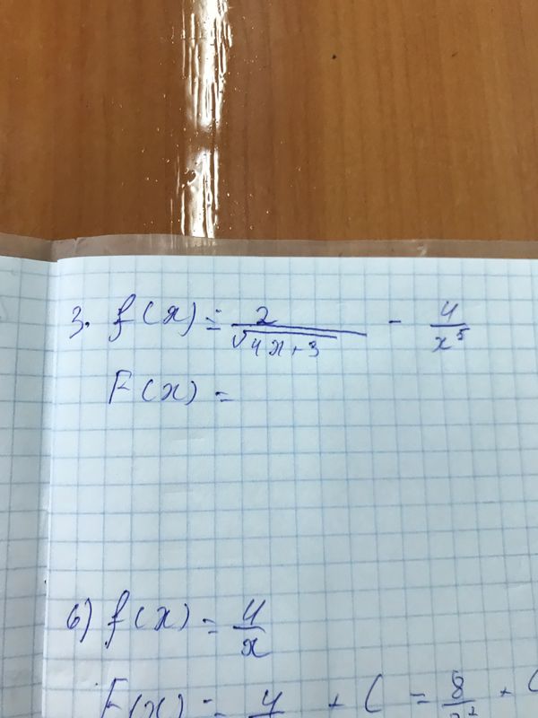 [m]f(x)=\frac{2}{\sqrt{4x+3}}-4x^{-5}[/m] тогда См. правила и таблицу: [m]F(x)=\frac{2}{4}\cdot 2\sqrt{4x+3}-4\cdot\frac {x^{-5+1}}{-5+1}+C;[/m] [m]F(x)=\sqrt{4x+3}+ \frac{1}{x^{4}}+C;[/m]