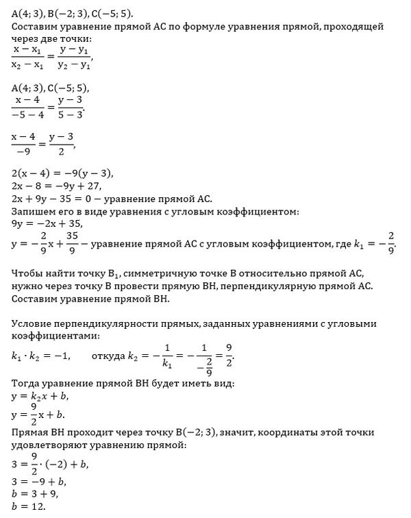 Здравствуйте! Помогите пожалуйста решить. Дан треугольник А (4;3),В(-2;3),С(-5;5).нужно найти точку В1 симметричную точке В относительно прямой АС. Уравнение прямой АС 2x-9y-35=0.