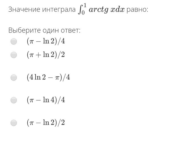 Интегрирование по частям ∫ udv=u*v- ∫vdu u=arctgx dv=dx du=dx/(1+x^2) v=x =(x*arctgx)|^(1)_(0)- ∫^(1)_(0) xdx/(1+x^2)=(x*arctgx)|^(1)_(0)-(1/2) ln(1+x^2)|^(1)_(0)= =arctg1-(1/2)ln2=(π/4)-(ln2)/2=(π-2ln2)/4=(π-ln4)/4