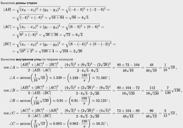 Даны координаты вершин треугольника на плоскости. Найти уровения сторон треугольника, уравнение медианы, биссектрисы и высоты, проведенных из вершины С треугольника АВС. Найти углы треугольника АВС, длину медианы и высоты, проведенных из вершины С.