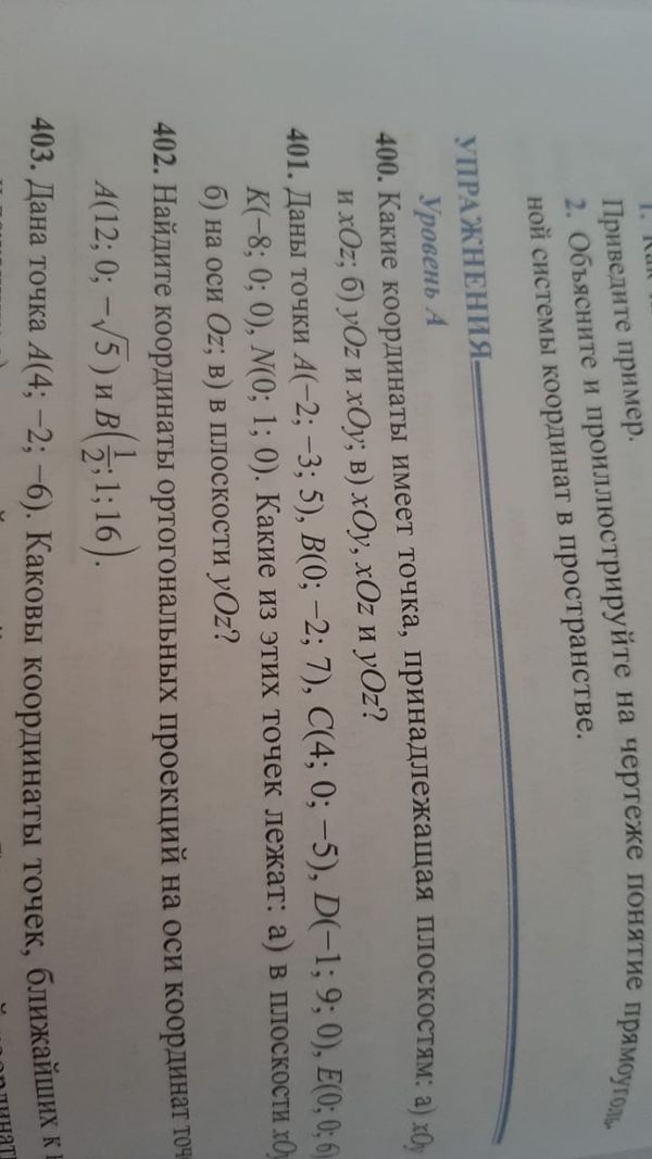 401. Даны точки А(-2;-3;5), В(0;-2;-7), С(4; 0; -5), D(-1; 9; 0), E(0;6;0), К(-8; 0;0), М(0; 1;0). Какие из этих точек лежат: a) в плоскости х0у; б) на оси 0z; в в плоскости y0z?