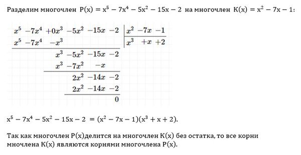 Поэтому [red]корни квадратного трехчлена[/red] [m]x^2-7x-1[/m] являются [red]корнями многочлена[/red] [m] x^5-7x^4-5x^2-15x-2 х[/m]