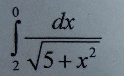 [m]=(ln|x+\sqrt{x^2+5}|)|^{0}_{2}=ln|\sqrt{5}|-ln|2+\sqrt{9}|=ln\sqrt{5}-ln5=ln\frac{\sqrt{5}}{5}=ln\frac{1}{\sqrt{5}}=-\frac{1}{2}ln5[/m]
