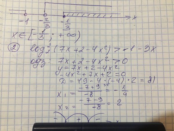 и сумма log^2_(2)(7x+2-4x^2)+1+3x >0 при любых ∈ (-0,25;2)