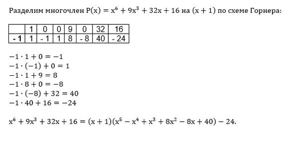 Используя схему Хорнера, найдите знаменатель и остаток многочлена P (x) = x ^ 6 + 9x ^ 3 + 32x + 16, деленного на многочлен x + 1.