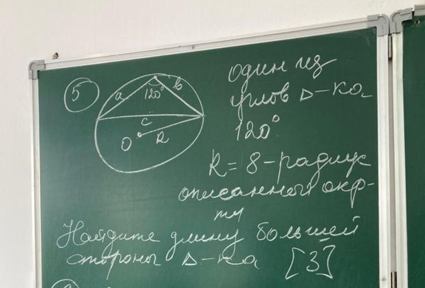 Один из углов треугольника 120°. R=8-радиус описанной окружности. Найдите длину большой стороны треугольника.