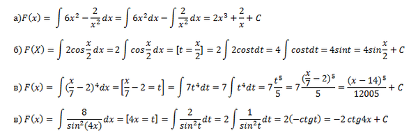 Помогите пожалуйста, общий вид первоначальной a) f(x) = 6x^2 - 2/x^2 b) f(x) = 2 cos(x/2) c) f(x) = (x/7-2)^4 d) f(x) = 8/sin^4 x
