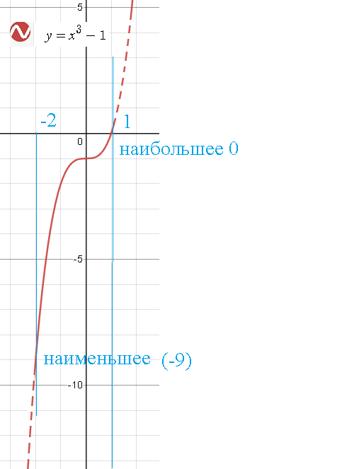 Находим производную: f`(x)=3x^2 f`(x) ≥ 0 Функция возрастает на (- ∞ ;+ ∞ ) в том числе и на [-2;1] Поэтому наименьшее значение в точке х=-2 Оно равно -9 f(-2)=(-2)^3-1=-9 Наибольшее в точке х=1 Оно равно 0 f(1)=1^3-1=0
