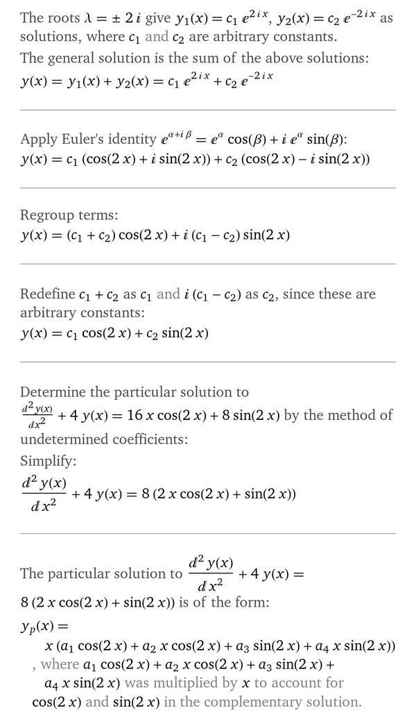 Найти общее решение линейного неоднородного дифференциального уравнения методом неопределенных коэффициентов. у" + 4у = 16хcos2x+8sin2x