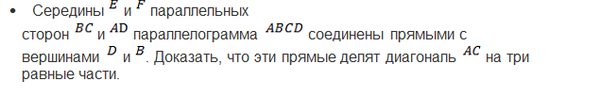 Середины E и F параллельных сторон BC и AD параллелограмма ABCD соединены прямыми с вершинами D и B . Доказать, что эти прямые делят диагональ AC на три равные части.