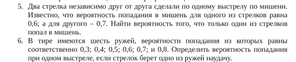 6. В тире имеются шесть ружей, вероятности попадания U3 которых равны соответственно 0,3; 0,4; 0,5; 0,6; 0,7; и 0,8. Определить вероятность попадания при одном выстреле, если стрелок берет одно из ружей наудачу,