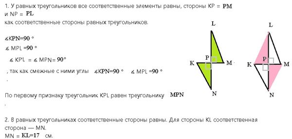 2. В равных треугольниках соответственные стороны равны. Для стороны KL соответственная сторона — MN.