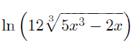 [m](ln12+\frac{1}{3}ln(5x^3-2x))=(ln12)`+\frac{1}{3}(ln(5x^3-2x))`=0+\frac{1}{3}\cdot \frac{1}{5x^3-2x}\cdot (5x^3-2x)`=\frac{1}{3}\cdot \frac{1}{5x^3-2x}\cdot (15x^2-2)=\frac{15x^2-2}{3\cdot (5x^3-2x)}[/m]