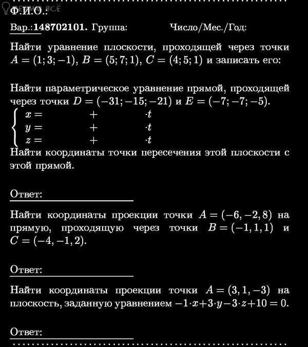 2) Найти координаты проекции точки А = (-6,-2,8) на прямую, проходящую через точки В = (-1,1,1) и С = (-4,-1,2).