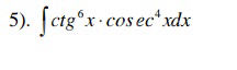 [m]∫ ctg^8x\cdot cosec^4xdx=∫ ctg^8x\cdot \frac{1}{sin^4x}dx=∫ ctg^8x\cdot \frac{1}{sin^2x}\cdot \frac{1}{sin^2x}dx=[/m] [m]d(ctgx)=(ctgx)`=-\frac{1}{sin^2x}dx[/m] ⇒[m] \frac{1}{sin^2x}dx=-d(ctgx)[/m] [m]∫ ctg^8x\cdot (1+ctg^2x)\cdot (-d(ctgx))=- ∫ctg^8xd(ctgx)- ∫ ctg^{10}xd(ctgx)=-\frac{ctg^9x}{9}-\frac{ctg^{11}x}{11}+C [/m]