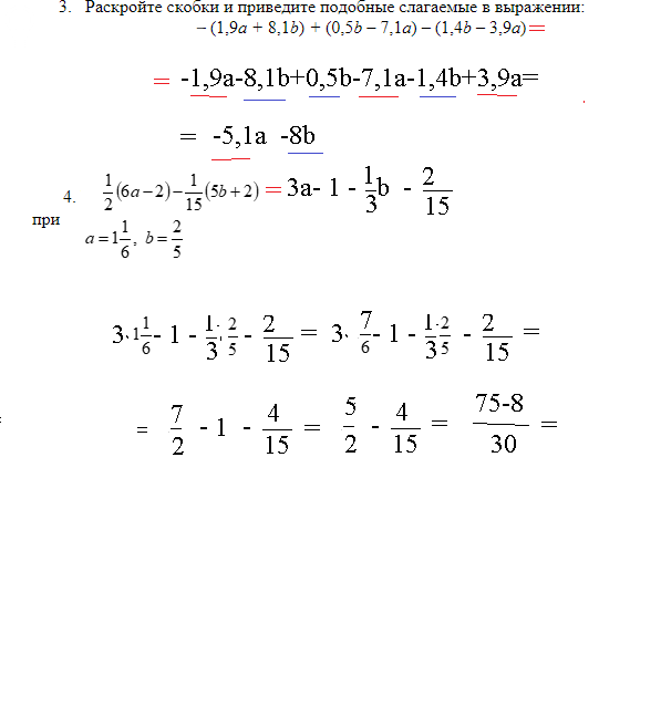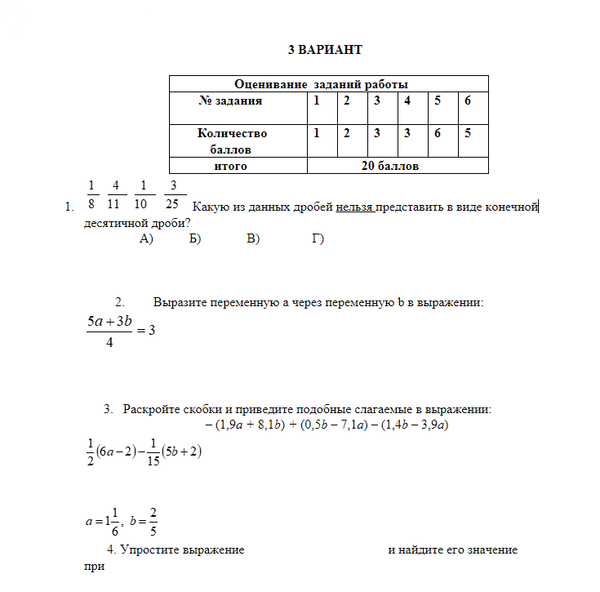1) Какую из данных пробей нельзя представить в виде конечной десятичной дроби? 2. Выразите переменную а через переменную в в выражении: 5a + 3b / 4 = 3 3. Раскройте скобки и приведите подобные слагаемые в выражении: 4. Выпростите выражение и найдите его значение при