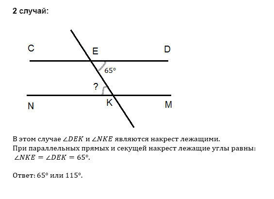 4. * Прямая EK является секущей для прямых CD и MN (E ∈ CD, K ∈ MN). ∠DEK равен 65°. При каком значении угла NKE прямые CD и MN могут быть параллельными?