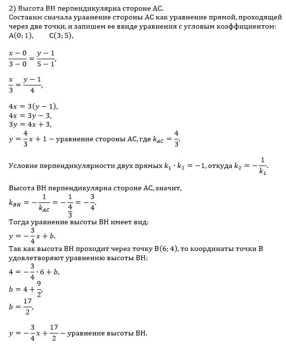 2) уравнение высоты, проведенной через вершину В, и ее длину;