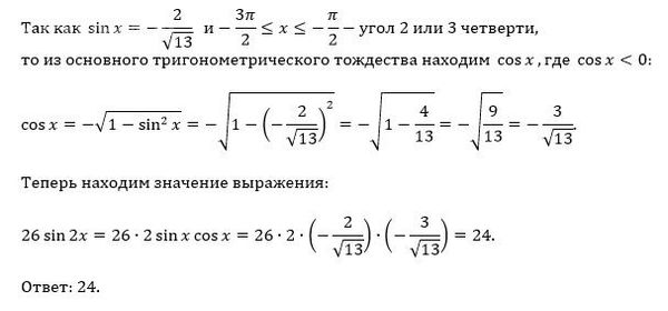 26 sin(2x), если sin(x) = - 2/sqrt(13) и 3π/2 ≤ x ≤ -П/2