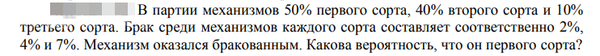 p(H_(1)/A)=p(H_(1))*p(A/H_(1))/p(A)=([b]0,5[/b])*0,02/(([b]0,5[/b])*0,02+([b]0,4[/b])*0,04+([b]0,1[/b])*0,07)=[b]?[/b] считайте