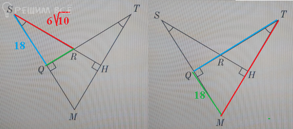 По теореме Пифагора QR^2=SR^2-SQ^2=(6sqrt(10))^2-18^2=360-324=36 QR=[b]6[/b] Δ SQR ∼ Δ TQM QR:QM=SR:TM TM=18*6sqrt(10)/6=18sqrt(10)