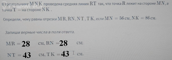 Средняя линия RT соединяет середины сторон MN и NK MR=RN=MN/2=56/2=[b]28[/b] NT=TK=NK/2=86/2=[b]43[/b]