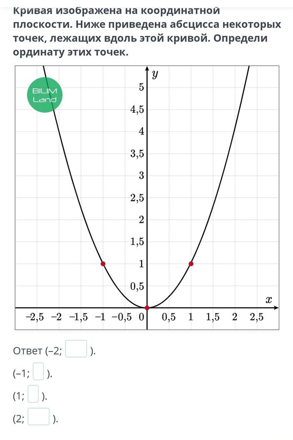 Кривая изображена на координатной плоскости. Ниже приведена абсцисса некоторых точек, лежащих вдоль этой кривой. Определи ординаты этих точек.