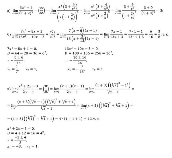 Найти пределы a) lim (x → ∞) (3x^3 + 4) / (x + 2)^3 b) lim (x → 1) (x^2 + 2x - 3) / √(x - 1) d) lim (x → ∞) (x^2 + 3)^2 / (x^2 + 1) b) lim (x → 1) (7x^2 - 8x + 1) / (13x^2 - 10x - 3) r) lim (x → 1) sin(x - 1) / (x^2 - 1)