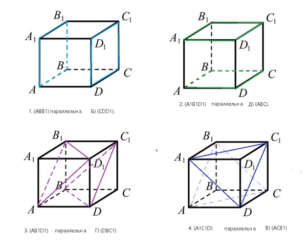 Дано куб АВСDA1B1C1D1. Установите соответствие между заданными плоскостями (1-4) и параллельными плоскостями (А-Д). 1. (АВВ1). 2. (А1В1D1). 3. (АВ1D1). 4. (А1С1D) А) (ВВ1С). Б) (СDD1). В) (АСВ1). Г) (DВС1). Д) (АВС).