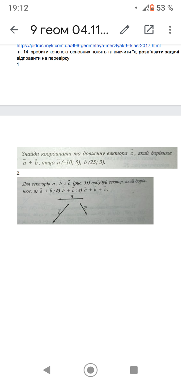 19:12 * Ы 53 % ® < 9 геом О04.11.. 7 И : https://pidruchnyk.com.ua/996-geometriya-merzlyak-9-klas-2017.html п. 14, зробити конспект основних понять та вивчити 1х, розв’язати задач!` в'удправити на перевирку 1 Знайди координати та дотш:у' ’ moy а + Ь, якщо а (-10; 5), b(25:3). — 2.