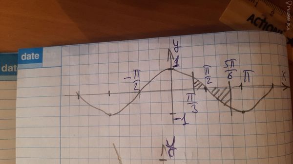 Int_(π/3)^(5π/6) cos x dx = Int_(π/3)^(π/2) cos x dx - Int_(π/2)^(5π/6) cos x dx =
