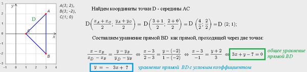 Скласти рiвняння медіани BD трикутника з вершинами А (3; 2), В (3; -2), C (1:0). Записати його в загальному виглядi.