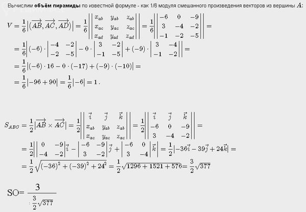 1. Находим объем пирамиды. [b]V[/b] 2. Находим площадь основания S_( Δ ABC) 3. Так как [b]V[/b]=(1/3)S_( Δ ABC)*SO SO=3[b]V[/b]/ S_(Δ ABC)