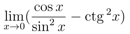 [m]\lim_{x \to 0} (\frac{cos(x)}{sin^2(x)} - ctg^2(x)) = \lim_{x \to 0} (\frac{cos(x)}{sin^2(x)} - \frac{cos^2(x)}{sin^2(x)}) = \lim_{x \to 0} \frac{cos(x)-cos^2(x)}{sin^2(x)} =[/m] [m]=\lim_{x \to 0} \frac{cos(x)(1-cos(x))}{1-cos^2(x)} = \lim_{x \to 0} \frac{cos(x)(1-cos(x))}{(1-cos(x))(1+cos(x))} =\lim_{x \to 0} \frac{cos(x)}{1+cos(x)} = \frac{1}{1+1} = \frac{1}{2}[/m]