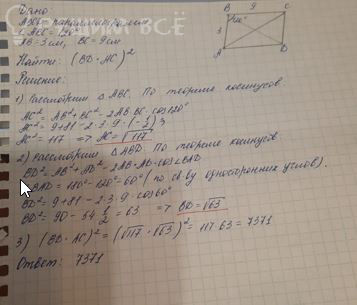 Стороны параллелограмма равны 3 см и 9 см, а угол между ними равен 120°. Чему равны диагонали параллелограмма? В ответе укажите квадрат произведения диагоналей.