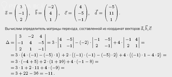 Доказать, что векторы а, b, с образуют базис, и найти координаты вектора d в этом базисе. (На фото 3.26)
