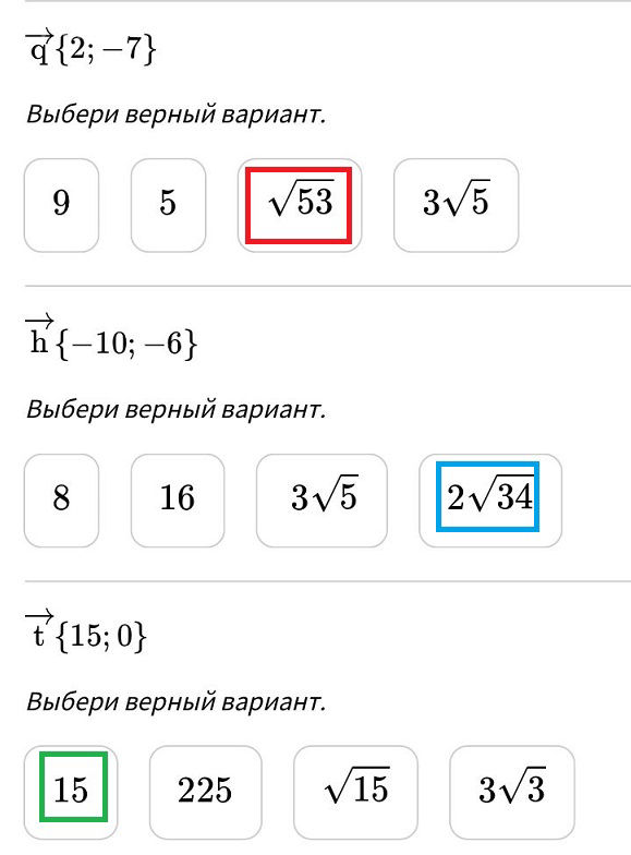 |vector{q}|=sqrt(2^2+(-7)^2)=sqrt(4+49)=sqrt(53) |vector{h}|=sqrt((-10)^2+(-6)^2)=sqrt(100+36)=sqrt(136)=sqrt(4*34)=2sqrt(34) |vector{s}|=sqrt(15^2+0^2)=sqrt(15^2)=15