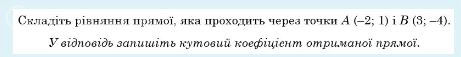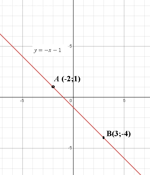 y=kx+b A(-2;1) 1=k*(-2)+b B(3;-4) -4=k*3+b {1=k*(-2)+b ⇒ b=2k+1 {-4=k*3+b ⇒ -4=3k+2k+1; 5k=-5 [b]k=-1[/b] b=-2*k+1=2(-1)+1=-1 [b]y=-x-1[/b]
