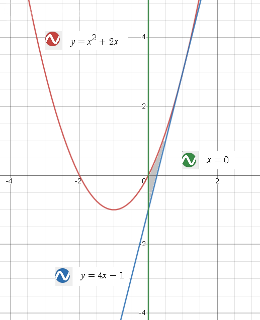 [m]S=∫ _{0}^{1}((x^2+2x)-(4x-1))dx=∫ _{0}^{1}(x^2+2x-4x+1)dx=[/m]
