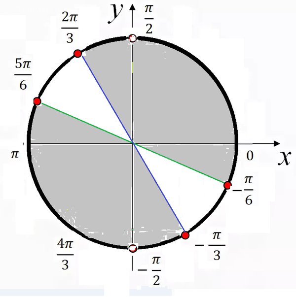 (-π/3)+2πn≤ 2x ≤ (4π/3)+2πn, n ∈ [b]Z[/b] (см. рис.1) Делим на 2: (-π/6)+πn≤ x ≤ (2π/3)+πn, n ∈ [b]Z[/b] - это общее решение неравенства (см. рис. 2) Интервалу (-π/2; π/2) принадлежит: (-π/2) < x ≤ (-π/3) и (-π/6) ≤ x < (π/2)
